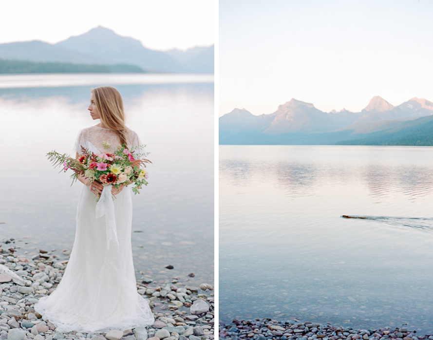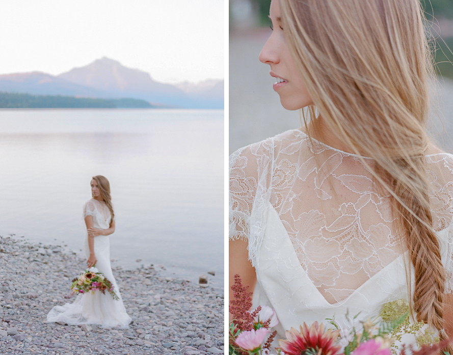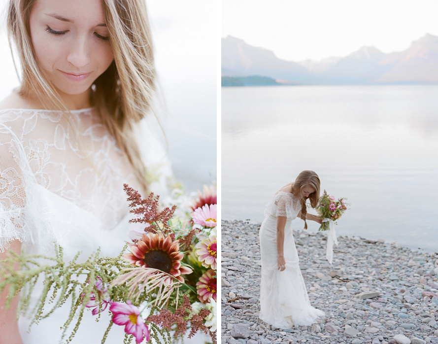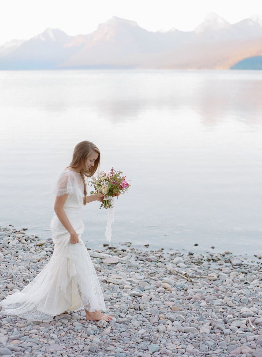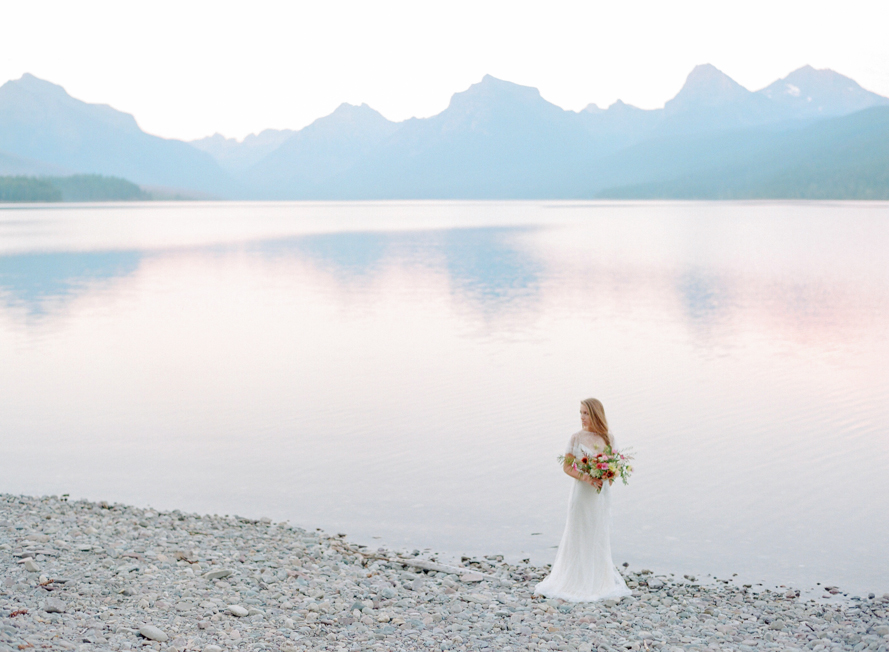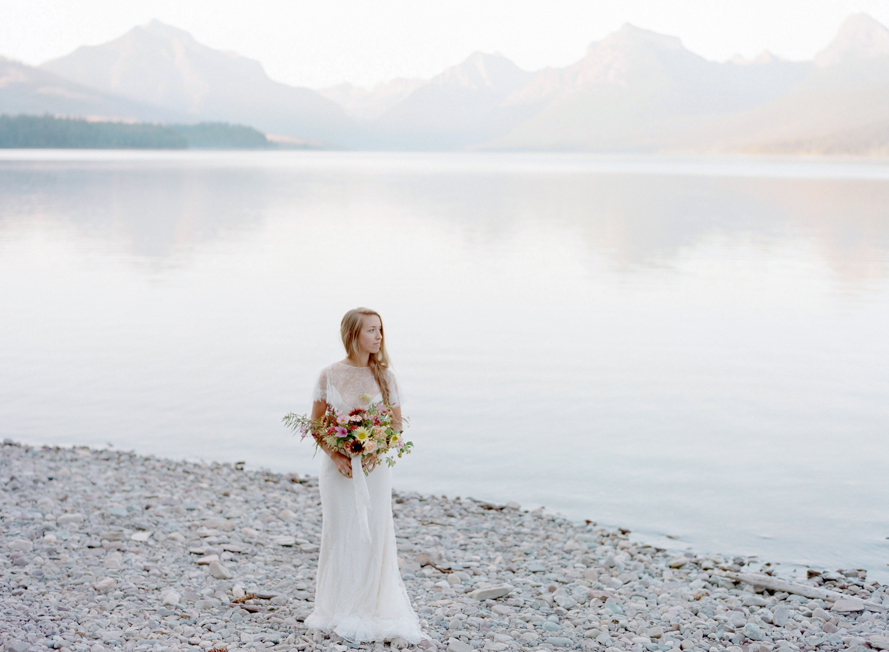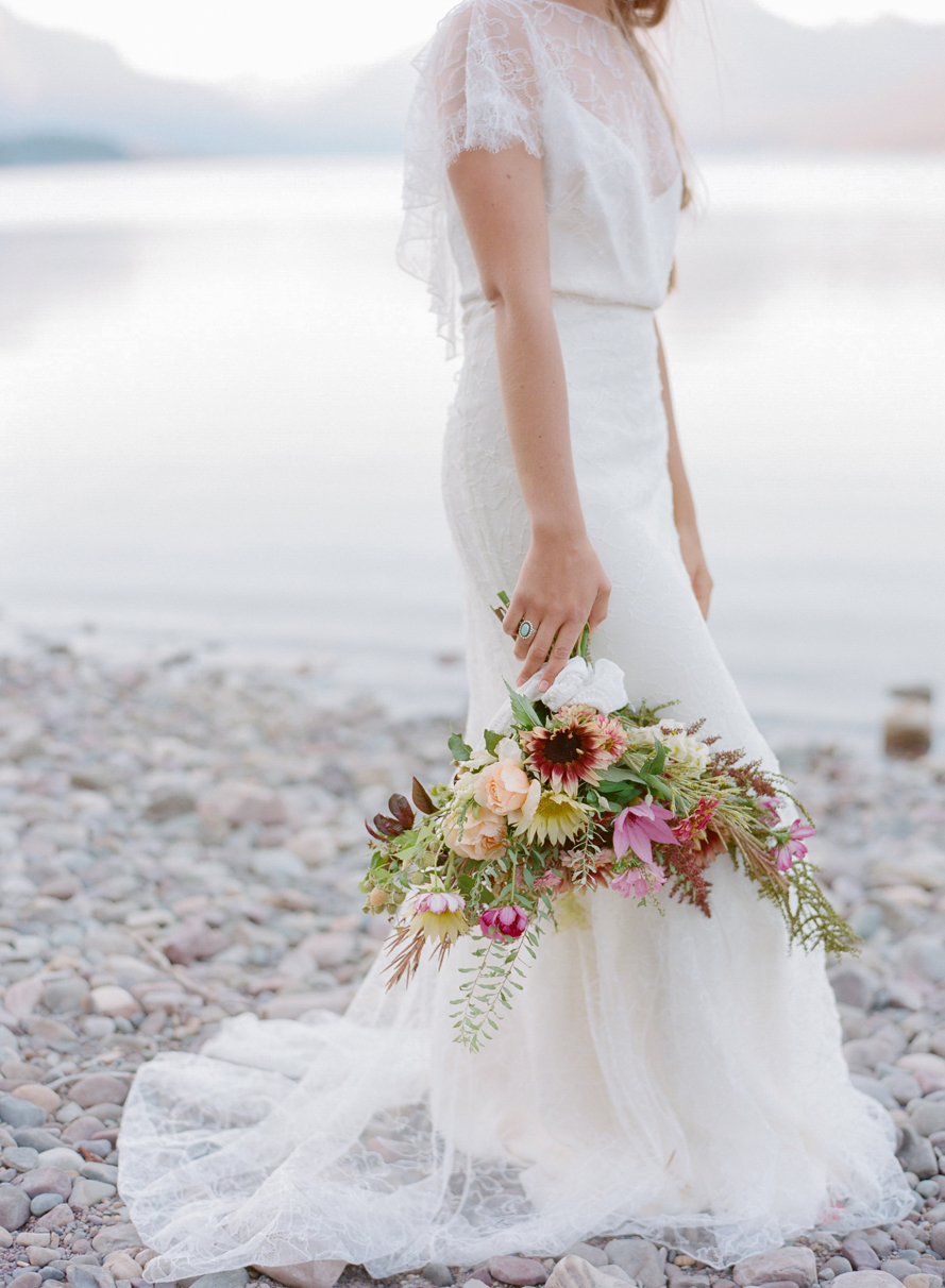 After a stunning wedding in Montana last fall, Greenwood Events and I spent an evening at McDonald Lake, feasting our eyes on a cotton-candy sunset that melted over a glass lake beneath the breathtaking backdrop of Glacier National Park. And we styled organic-like bridal inspirations with a beautiful, barefoot bride, who cradled a bouquet of sunset-colored flowers grown entirely by Greenwood Events. Darci & Arden Greenwood are true artists and genuine talents.