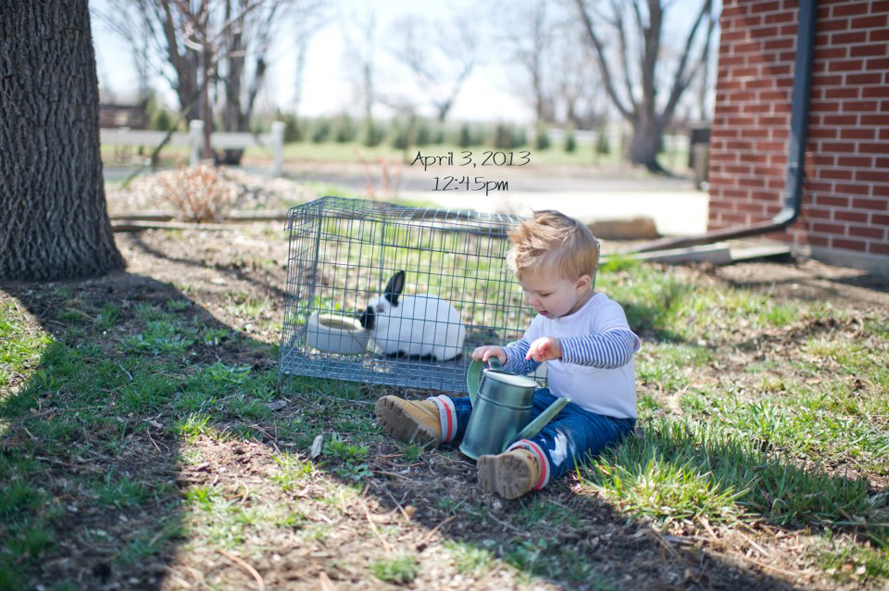 We’re taking care of one of great-grandpa’s bunnies this month, so today I let you help me with the day-to-day duties. Last year, we housed Cherry for a few months, but you were too little to remember. Now you’re big and strong. So we got to it! Since it was so warm outside today, I cleaned out our new friend’s home, and let you help me give her fresh water. But you were so excited about the fact that there was actual water inside the can (it’s true, I always make you stop playing in the dog’s water bowls!), that you completely lost interest in anything bunny related. You carried your water-can all over our yard and did a great job emptying it all by yourself—albeit most of it covered your shirt—but you were really efficient nonetheless. And I suppose fluffy little Lily didn’t mind one bit. Let’s just be honest, I think she’s still a bit intimidated by your over-the-top-cuteness.