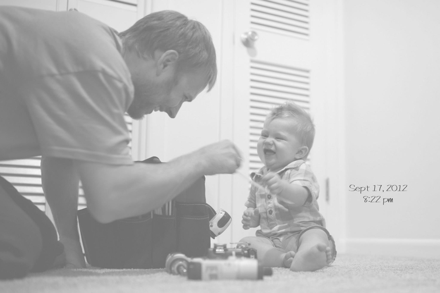I melt when I look at this. The way you love life so much that the smallest of things makes you happy. Squawking at the drills and toolbox of dads made me smile. But when you pulled out a zip-tie and did a sword fight with daddy, all three of us laughed so hard we had tears. Real, flowing tears. The things you find amusing change on a weekly basis. I am sure that by this time next week, zip-tie sword fighting won’t even be worth your glance. But dad and I are learning to play these games until your belly bares no more sound. Because then, at least, we can say we reveled in these moments.