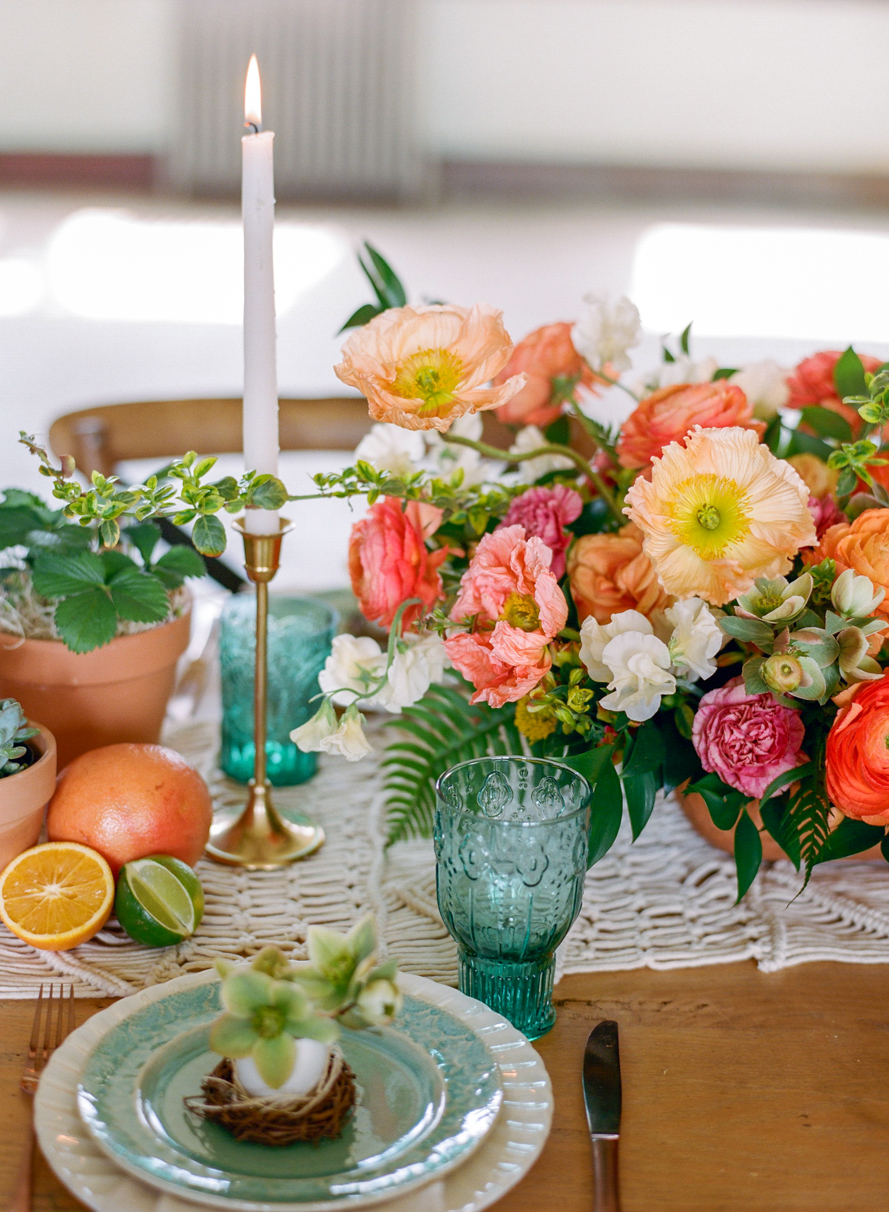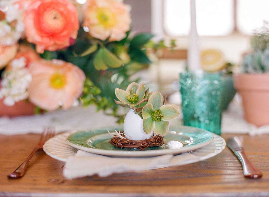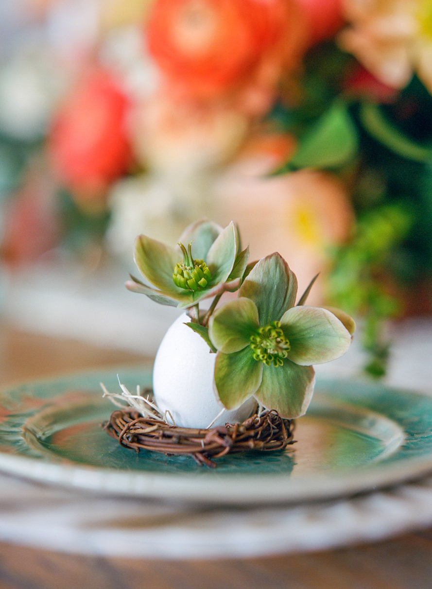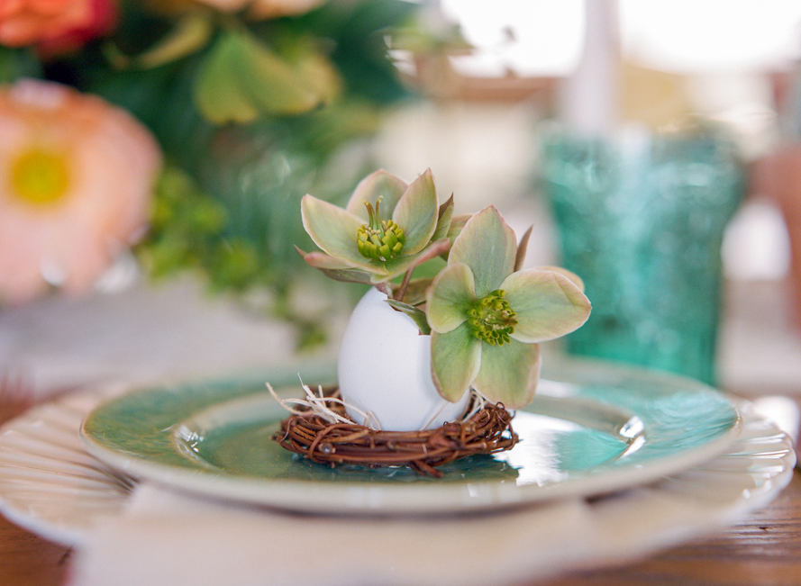 So get ready to SMILE your face off! Spring is such a joyful time of year. After the long dark days of winter, nothing could seem more refreshing than a table set with bright and beautiful citrus tones for a holiday that celebrates new life, new growth, and the return of light and warmth. We set our Easter table under an armful of blooming quince branches we’d hung. We laid a natural wood table with a gorgeous macramé runner from Anthropologie and set the table in textural tableware in shades of white and pale blue-green. For a dramatic centerpiece, we filled a terracotta roaster with all the best blooms of the season: Stunning ranunculus, sweet pea, roses, poppies, hellebores, French dianthus and lush, textural greens and accented with cut citrus fruits and sweet Easter eggs. We finished the table with darling little egg planters filled with fresh hellebore blooms. And our smiles were…huge.