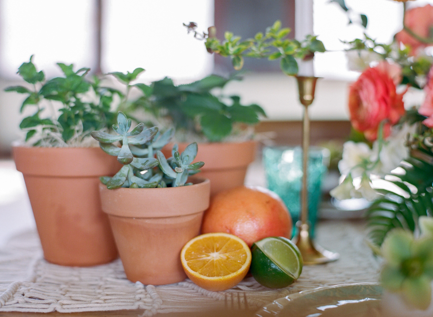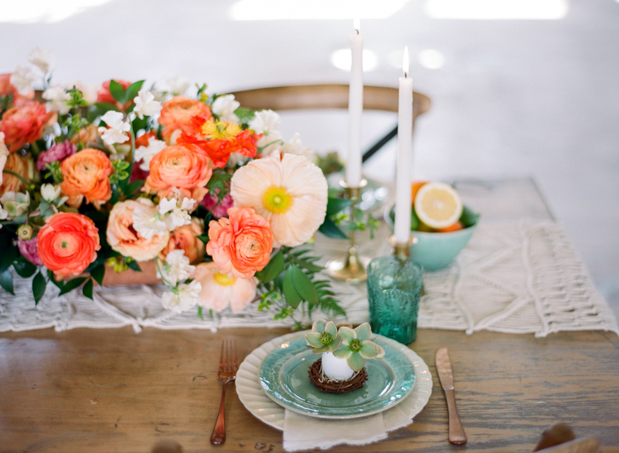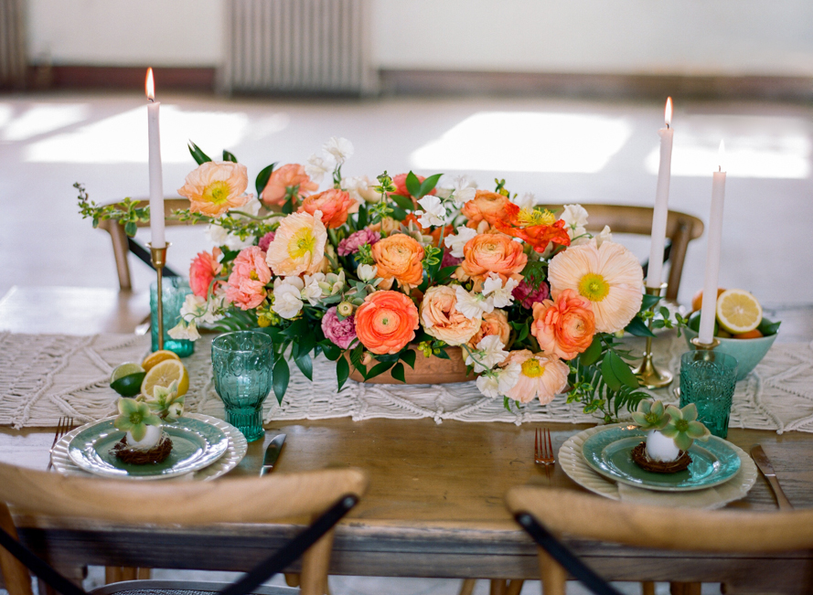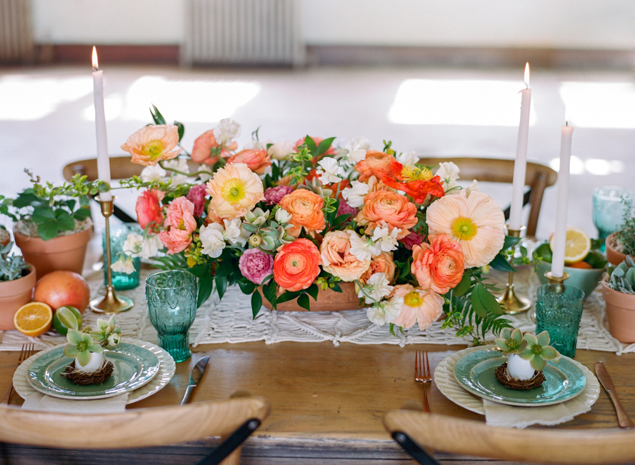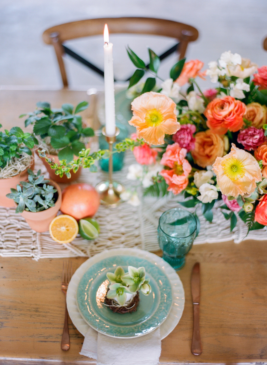 So get ready to SMILE your face off! Spring is such a joyful time of year. After the long dark days of winter, nothing could seem more refreshing than a table set with bright and beautiful citrus tones for a holiday that celebrates new life, new growth, and the return of light and warmth. We set our Easter table under an armful of blooming quince branches we’d hung. We laid a natural wood table with a gorgeous macramé runner from Anthropologie and set the table in textural tableware in shades of white and pale blue-green. For a dramatic centerpiece, we filled a terracotta roaster with all the best blooms of the season: Stunning ranunculus, sweet pea, roses, poppies, hellebores, French dianthus and lush, textural greens and accented with cut citrus fruits and sweet Easter eggs. We finished the table with darling little egg planters filled with fresh hellebore blooms. And our smiles were…huge.