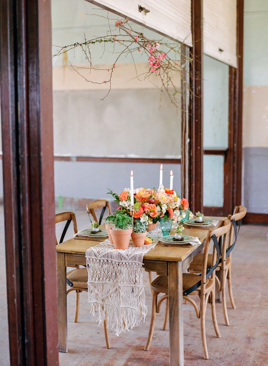 Dinnerware, Glassware & Macrame Table Runner: Anthropologie | Silverware: Sur La Table
